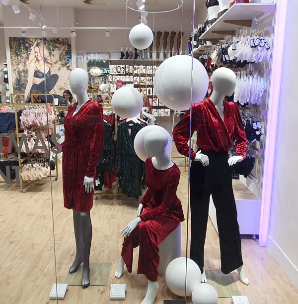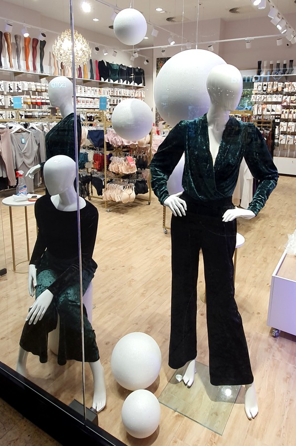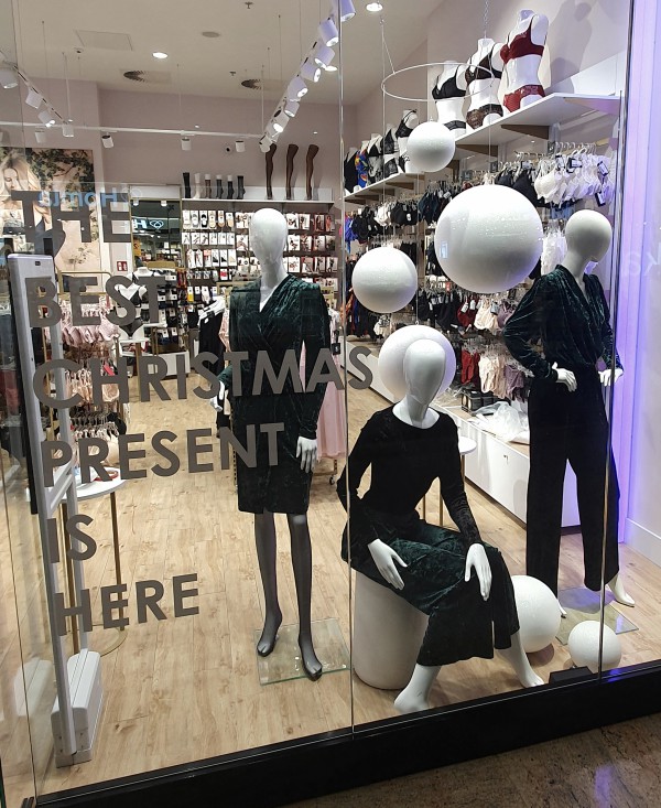 Minimalistyczne, "śnieżne" kule na świątecznych witrynach marki Gatta. "The best christmas present is here"